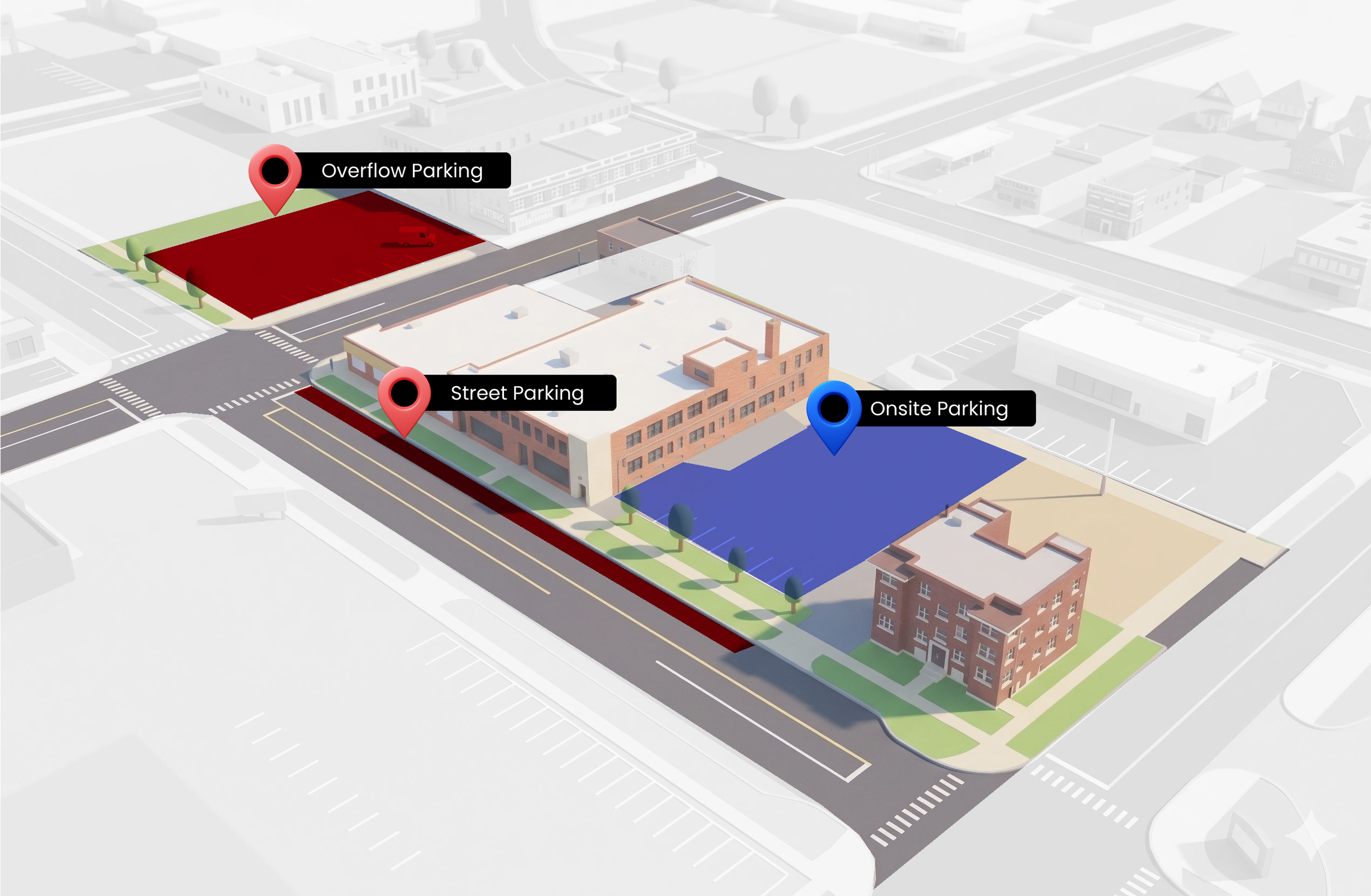 Street and Overflow Parking (Red) Available along S Main St and W Monroe St, adjacent to the building. A dedicated overflow lot is located across W Monroe St, north of the building.